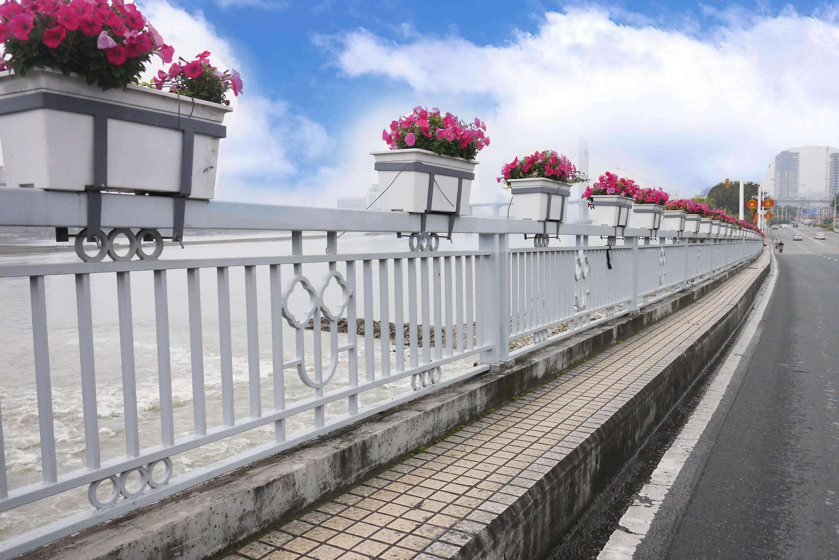 橋梁防撞護欄的美化功能:橋梁通過橋梁防撞護欄的不同材質、不同的形式、不同的造型及不同的顏色,達到與道路環境的融洽和協調,起到美化橋梁、美化環境的作用。